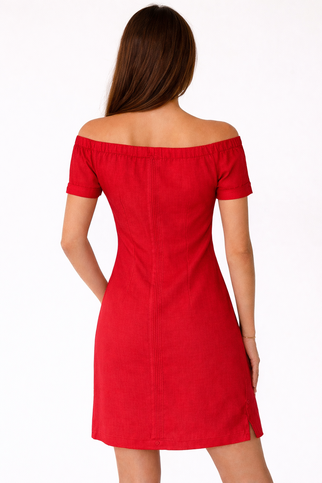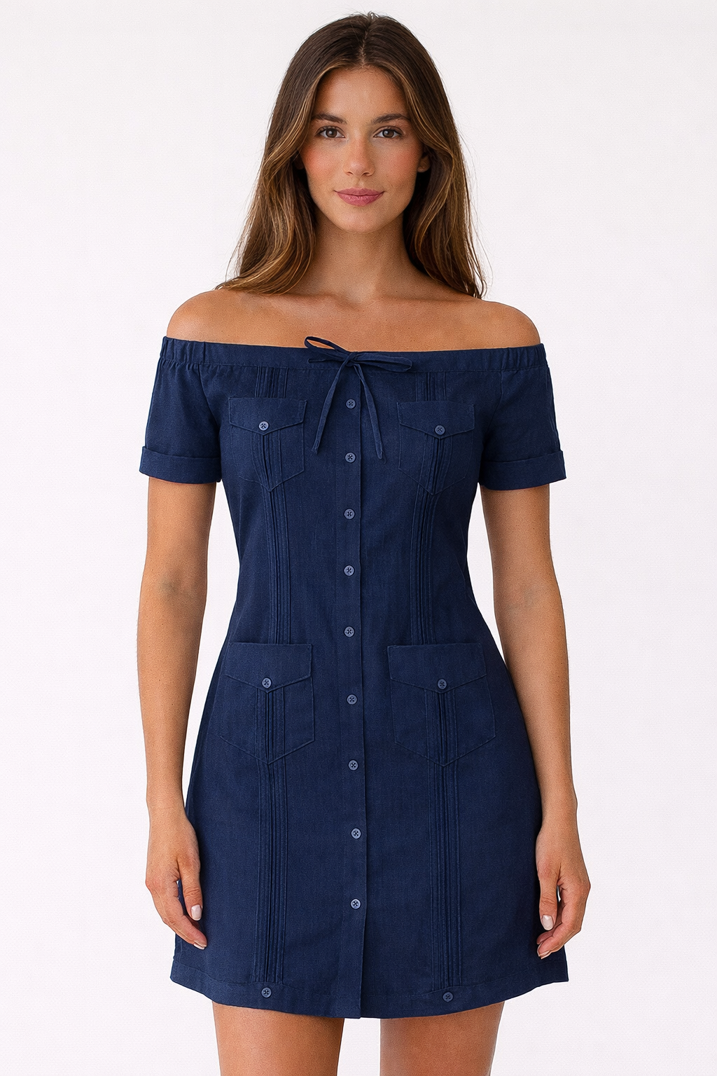 Breezy, elegant, and timeless — this 100% linen guayabera dress is designed for warm days, coastal escapes, and effortless style. Crafted from premium breathable linen, this off-the-shoulder silhouette features classic guayabera pleats, functional pockets, and a flattering tailored fit that hugs in all the right places while keeping you cool.