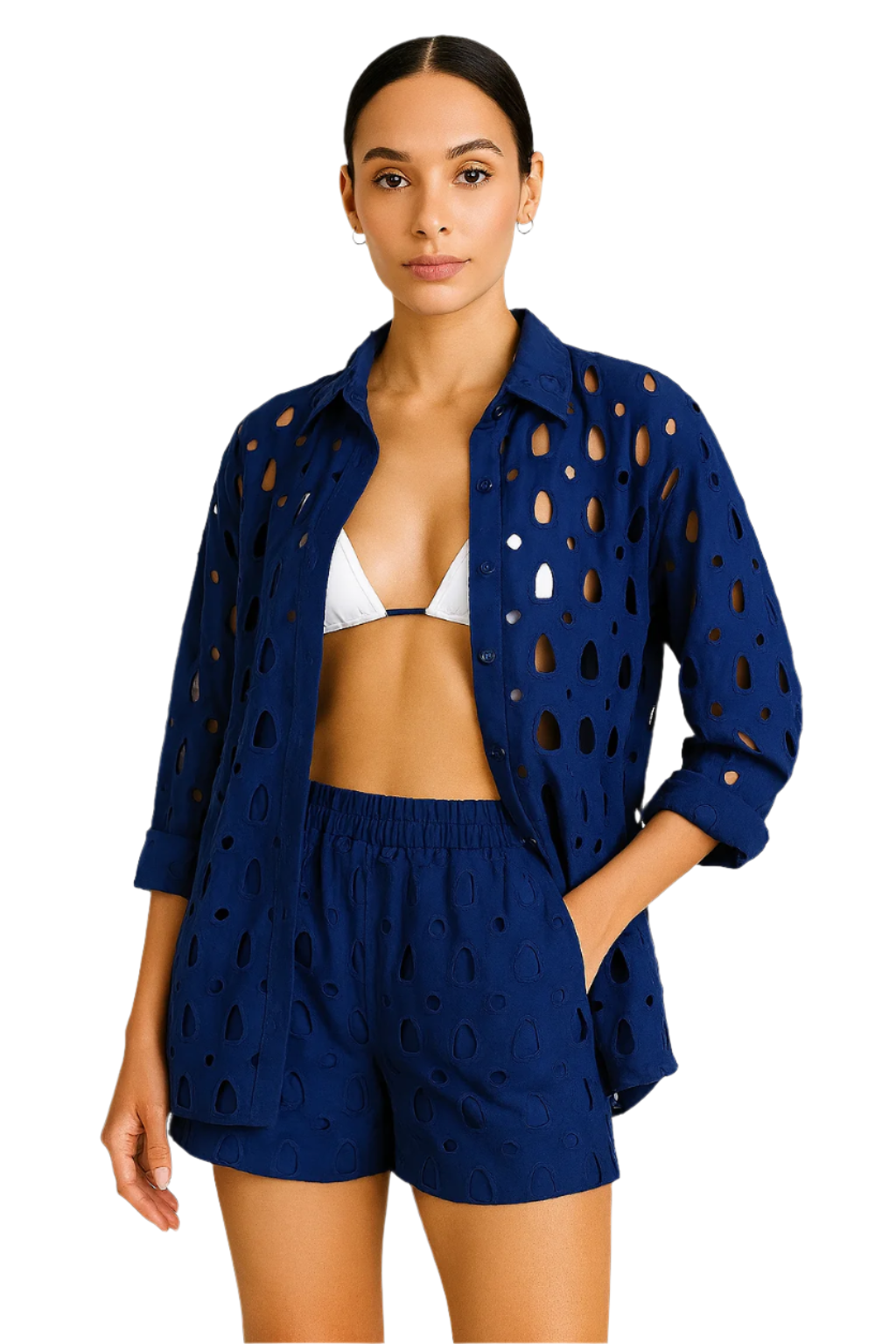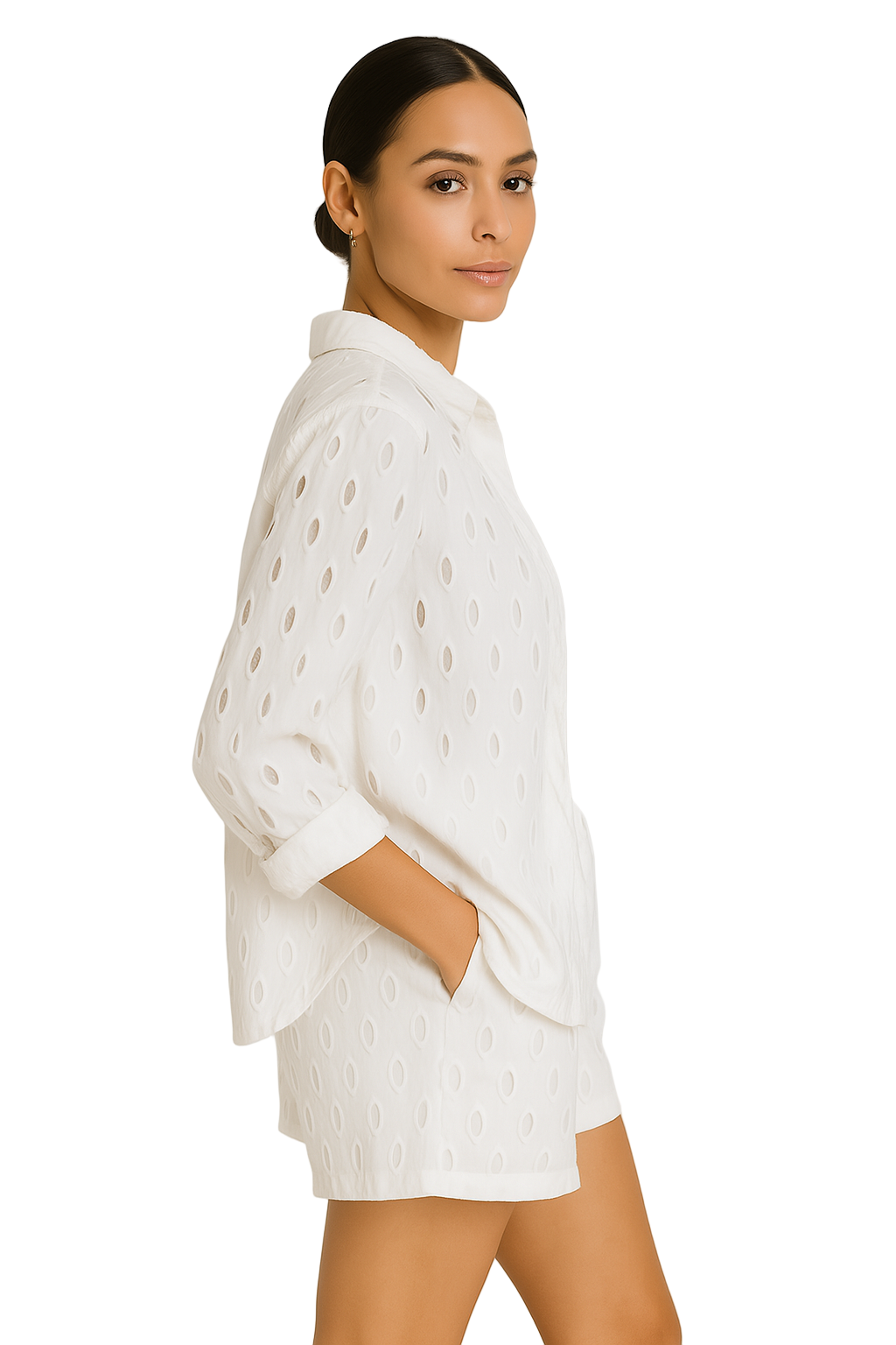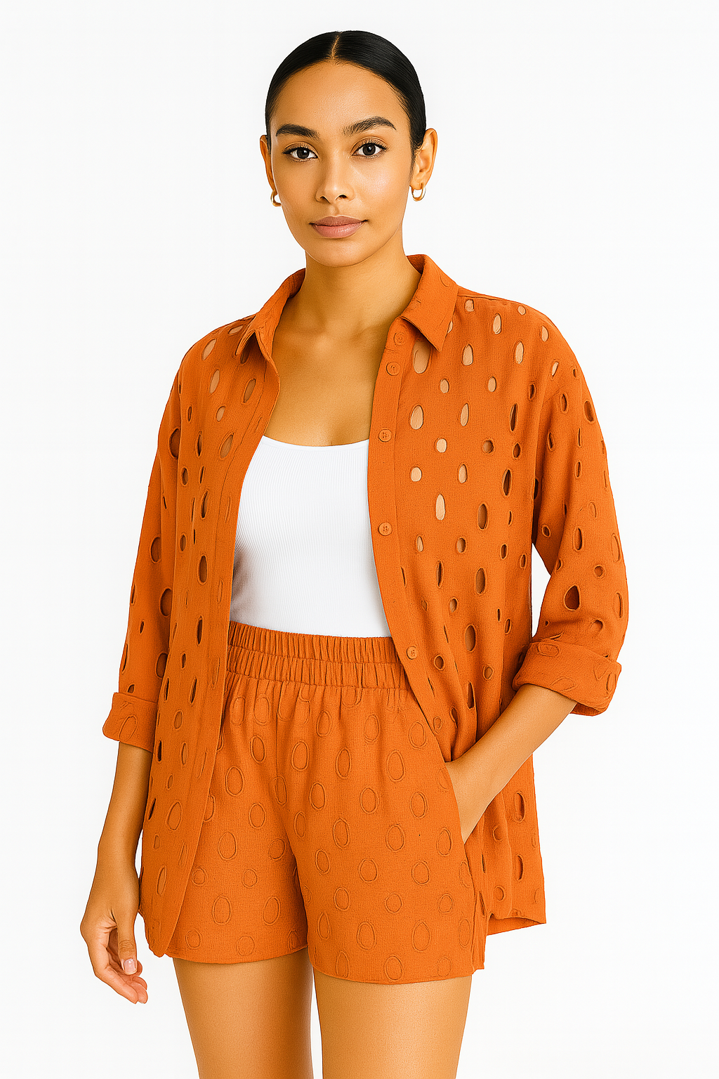 Our 2-piece embroidered eyelet set features a lightweight button-up shirt and high-waisted shorts designed for effortless style and all-day comfort. Whether you're lounging at a resort, heading to brunch, or strolling the beach, this breezy set brings the perfect balance of chic and breathable.