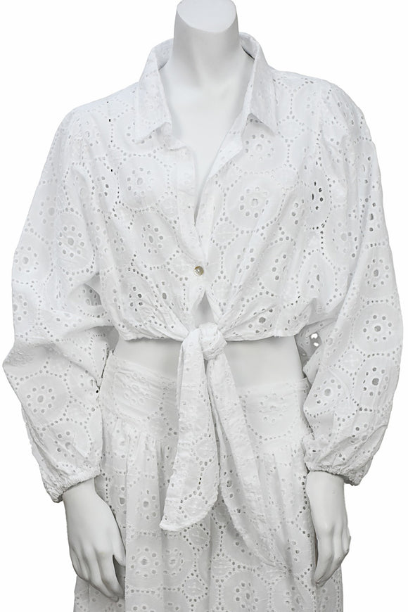 Women's White Eyelet Cotton Long Sleeve Tie-Front Top – LCB3118
