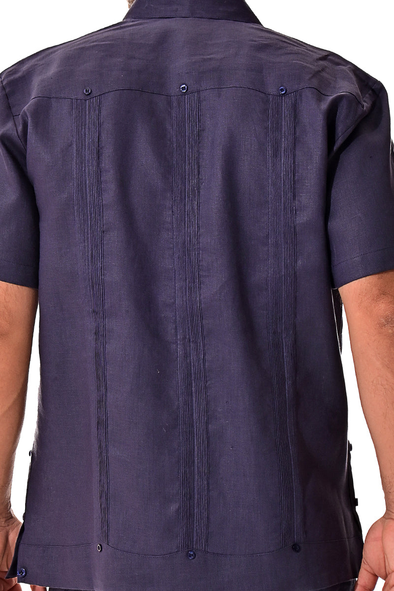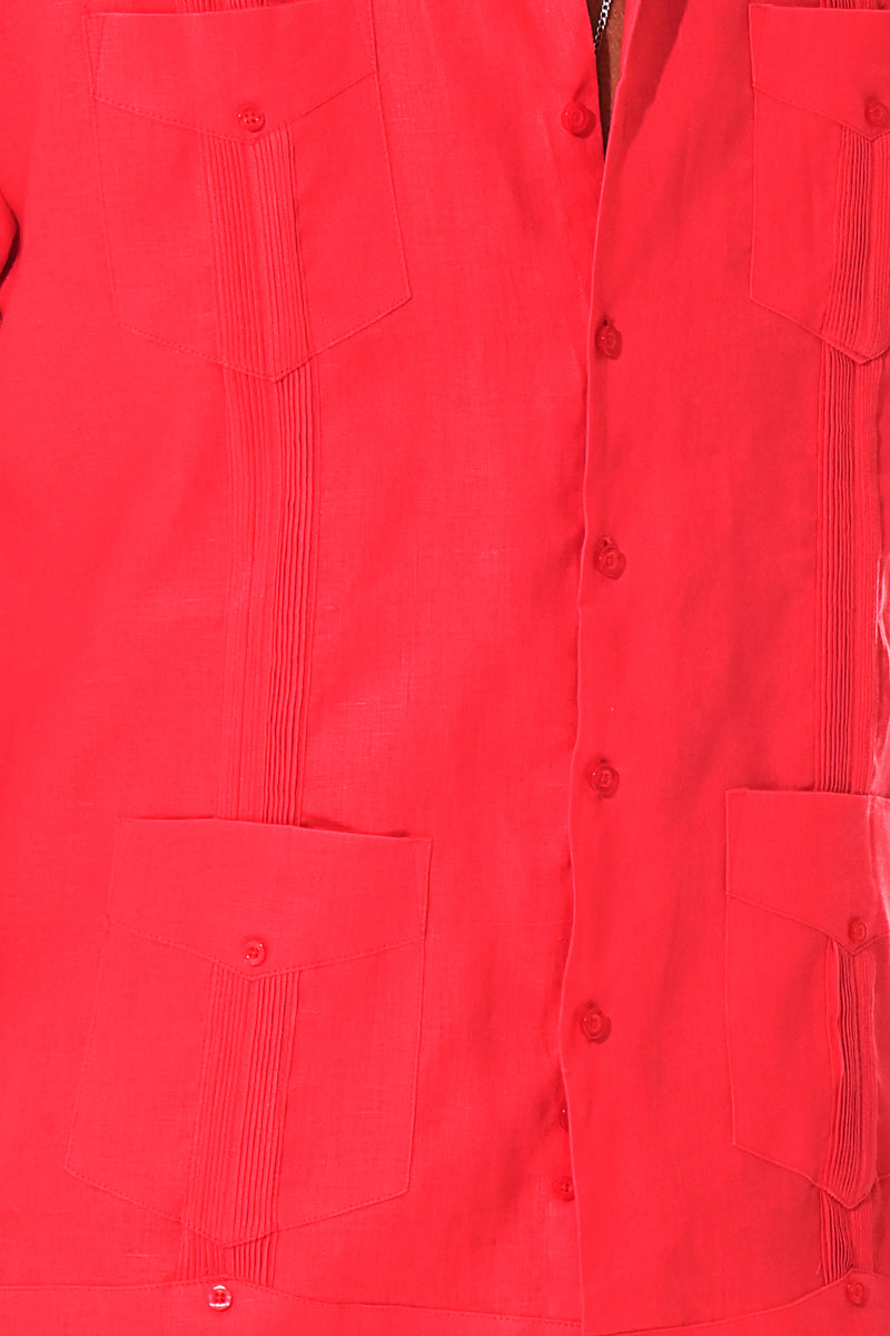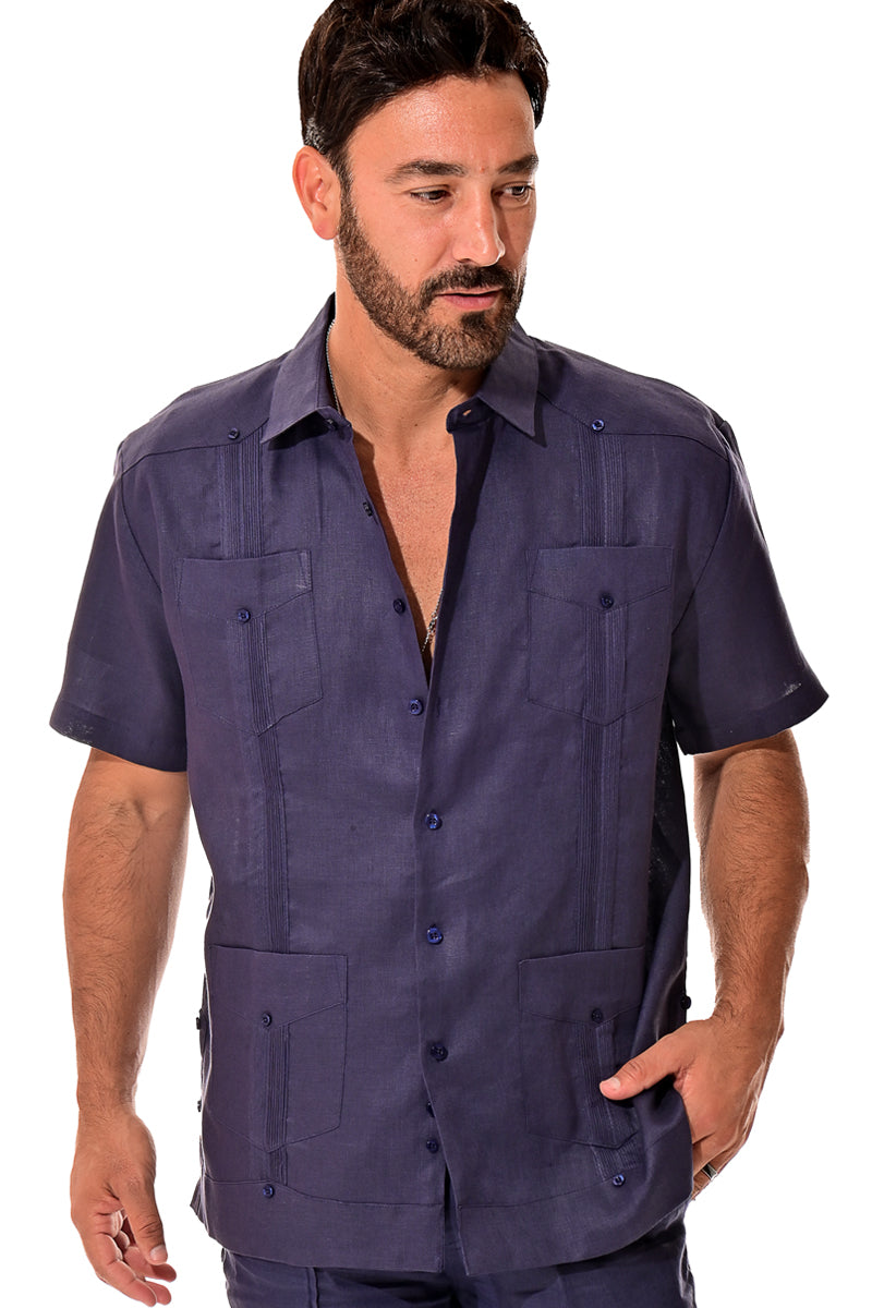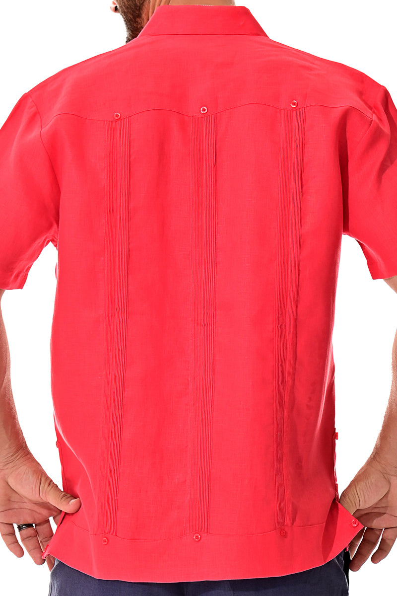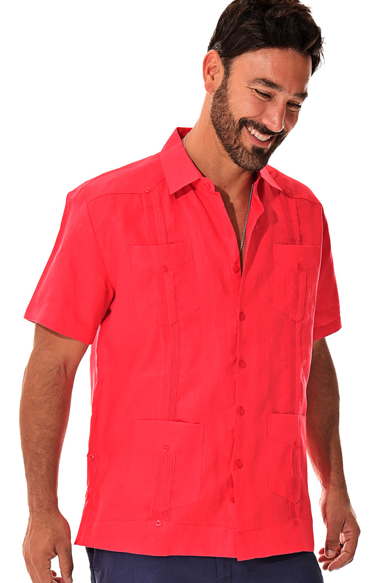 This is a classic Short sleeve men's guayabera features two pin tucked panels down the front and back of the shirt. The four pocket design is traditional A guayabera remains to be a time-less staple piece in any gentleman's wardrobe. This relaxed BOHIO brand men's button down Caribbean style shirt is constructed in 100% Soft Linen fabric. You can choose from 5 beautiful colors: White, Navy, Red, Lt. Blue, & Natural. We have a wide variety of sizes to choose from including ( Small to XXXL) . Men's Guayabera shirts are always perfect for any gathering. This island inspired shirt has a straight bottom hem with side vents allowing you to comfortably move around throughout the day without a snag.