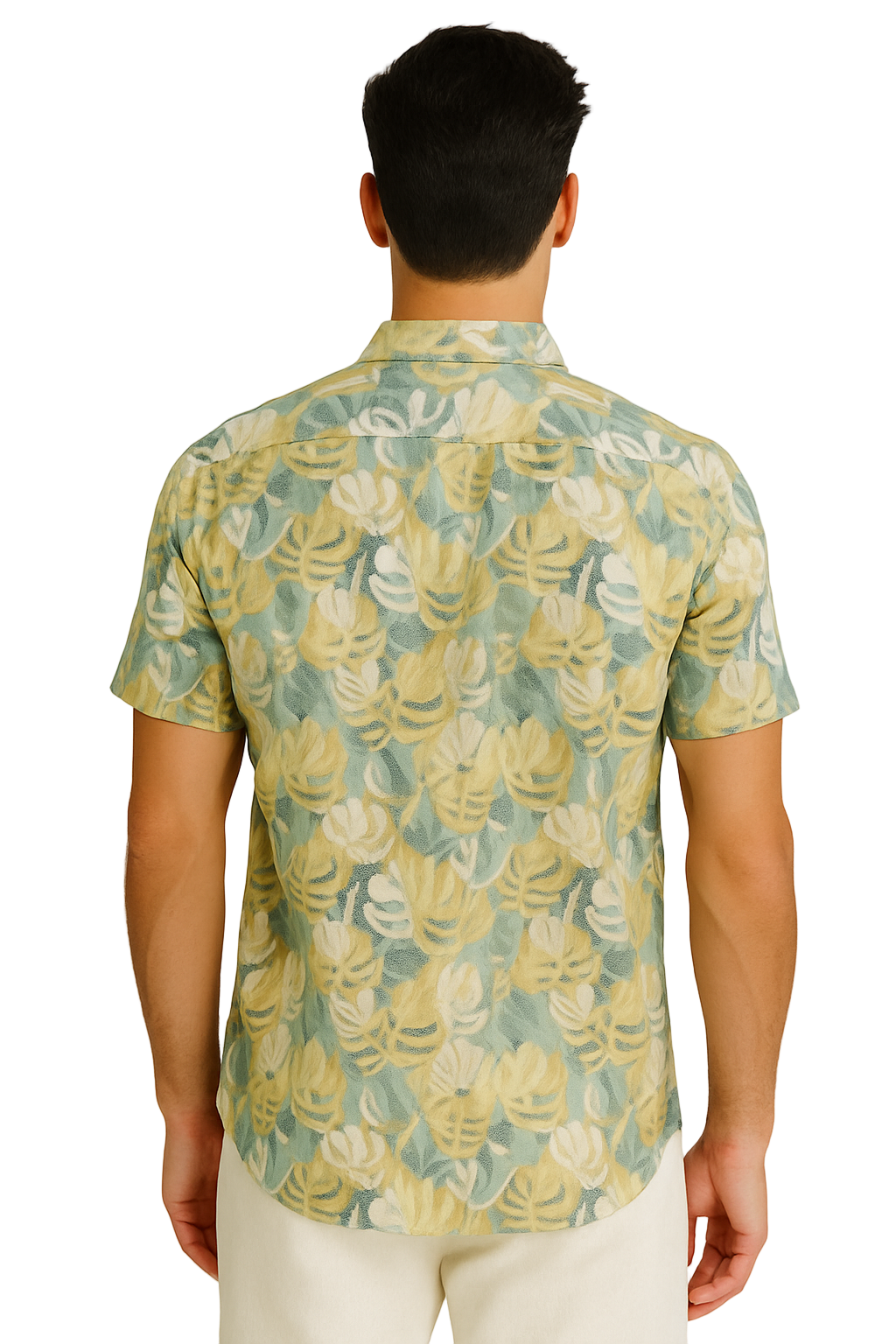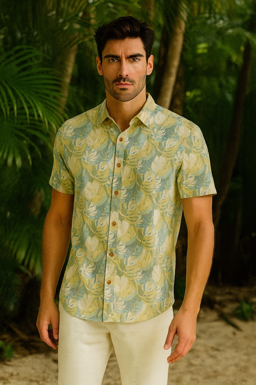 Men’s Tropical Leaf Print Button-Up Shirt – Short Sleeve Casual Resort Wear (55% Cotton, 45% Polyester) - MRS3555