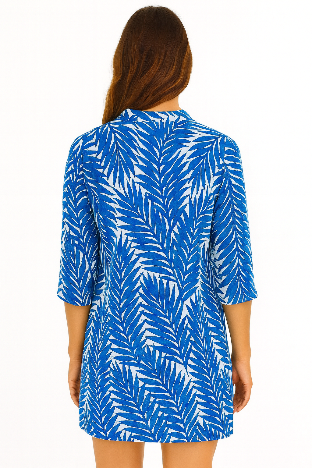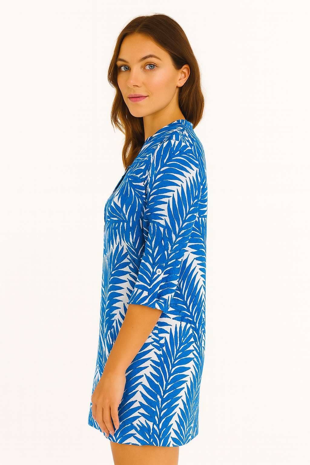 Blue Palm Leaf Print Cotton Tunic – 100% Cotton Resortwear Top, Blouse or Dress - LCT3591