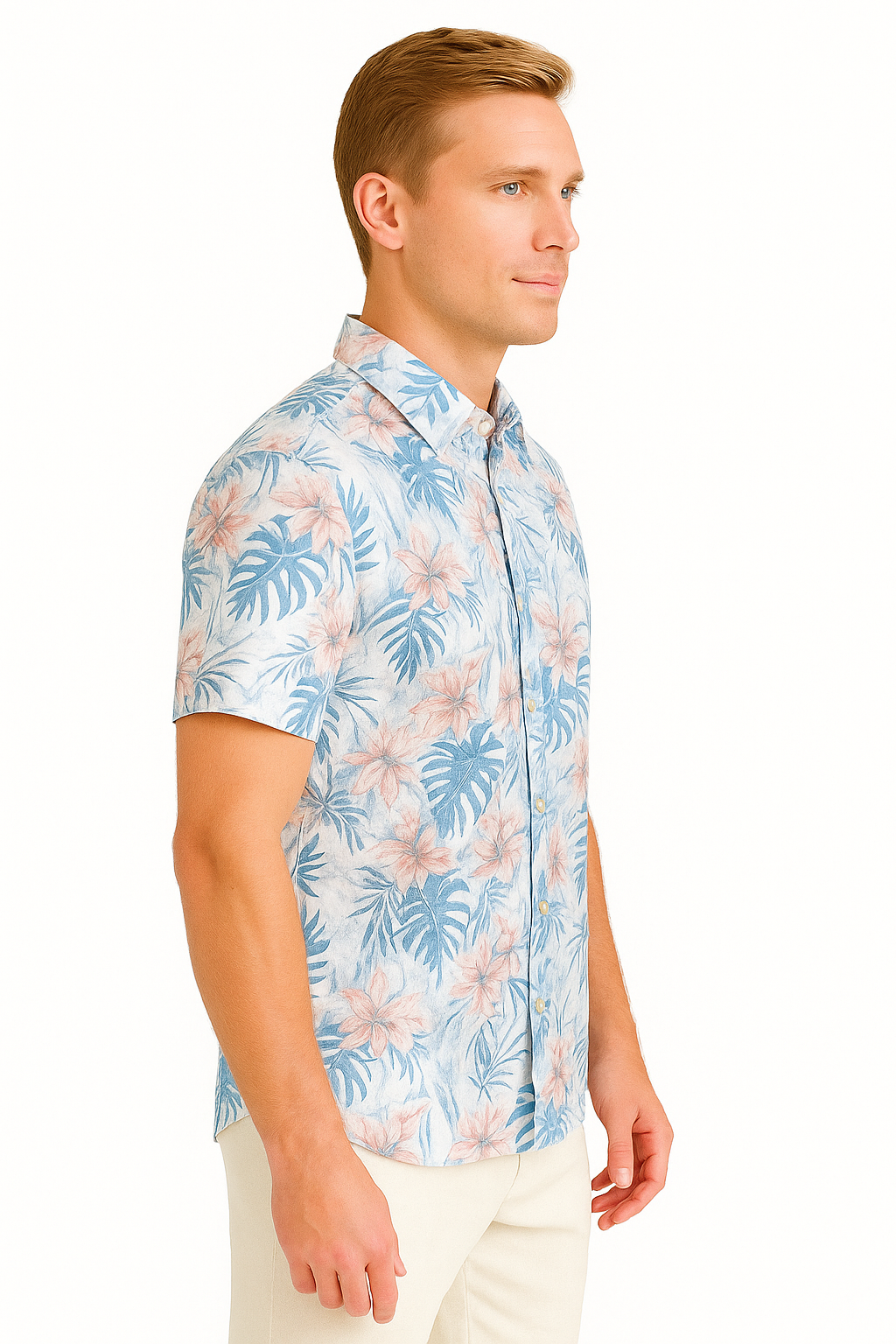 Lightweight, breathable, and effortlessly stylish — the Coastal Breeze Cotton Gauze Shirt is your perfect companion for warm-weather days. Crafted from soft cotton gauze, this short-sleeve button-down keeps you cool and comfortable while still looking sharp. The tropical floral print in calming blue and peach tones brings laid-back vacation vibes, whether you’re headed to the beach, a resort dinner, or a summer outing.