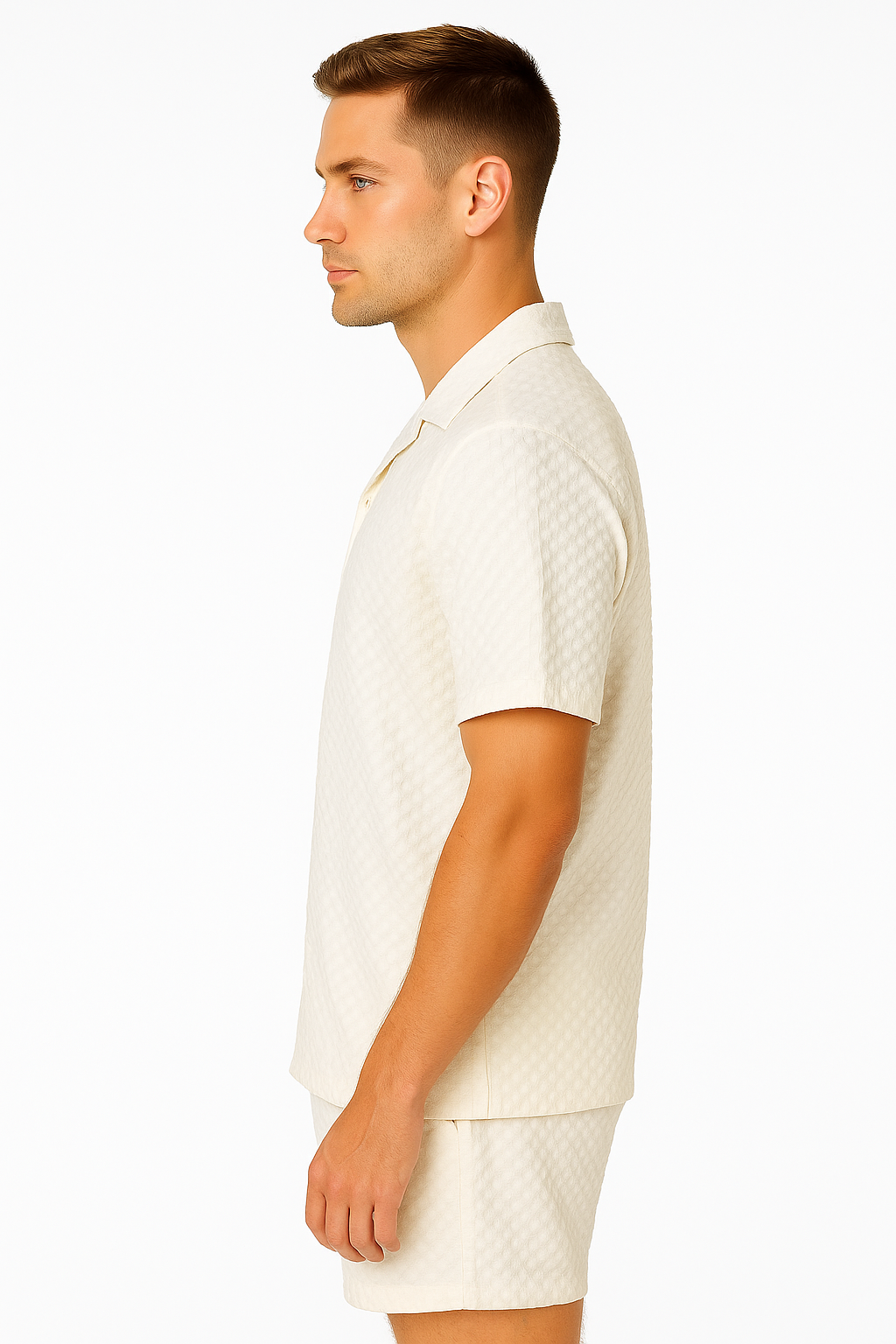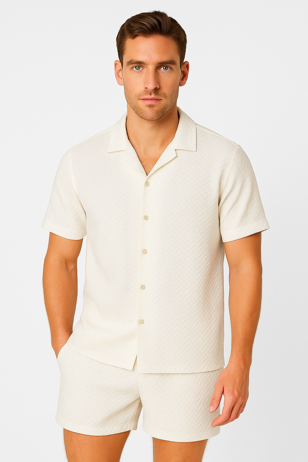 The set includes a short-sleeve button-up shirt and matching tailored shorts, featuring a subtle textured pattern that adds depth and sophistication. The camp collar design gives the shirt a timeless resort vibe, while the button-down front and clean hem make it easy to style tucked or untucked. The shorts are equipped with an elastic waistband and side pockets, providing both function and comfort for all-day wear.