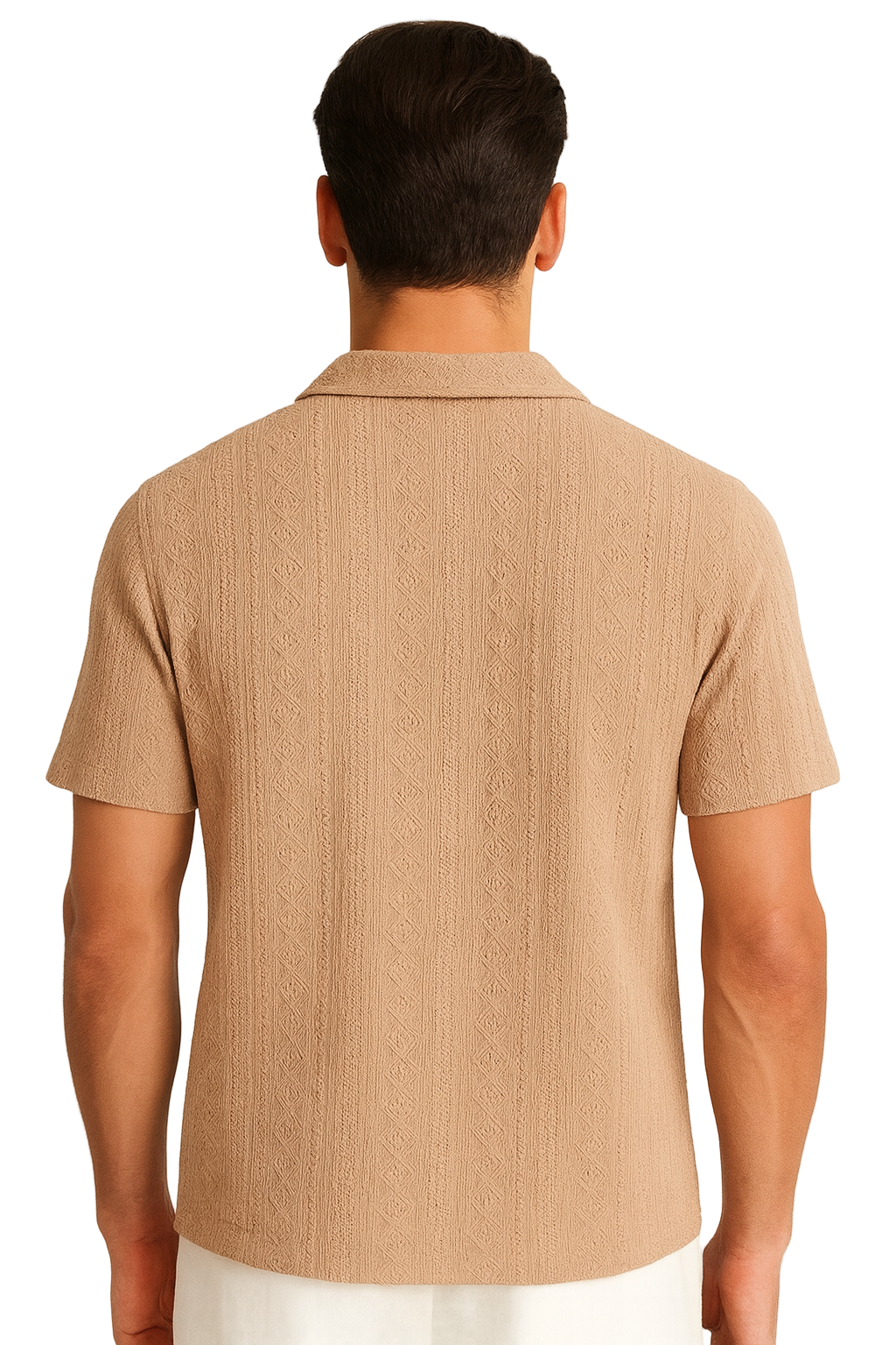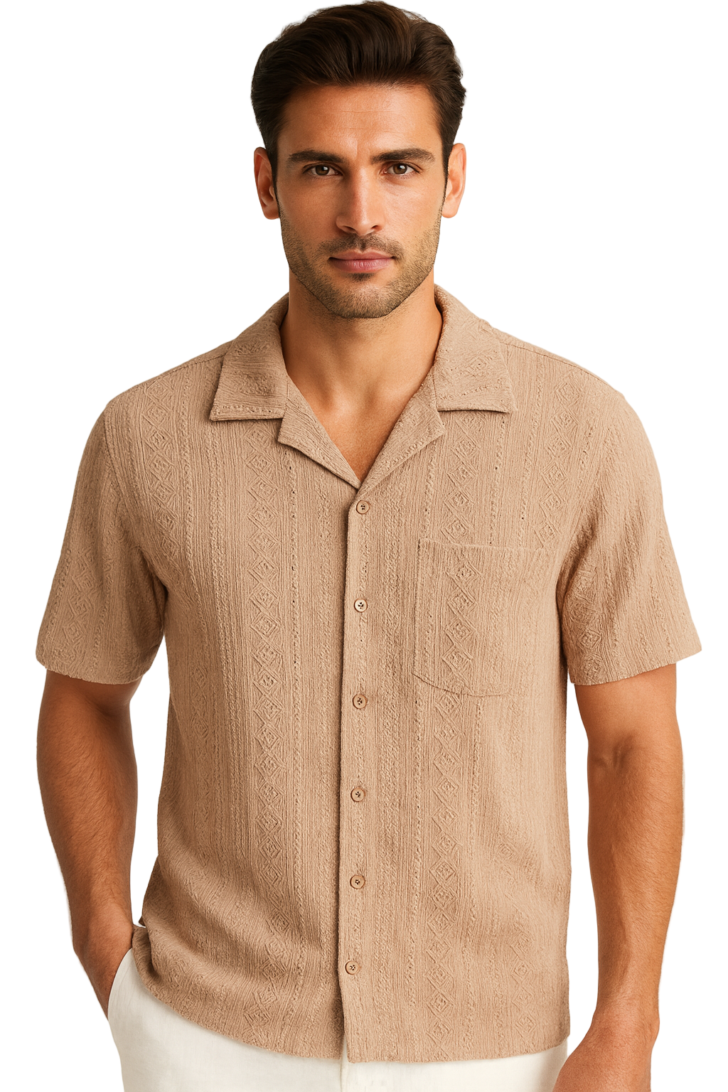 Men’s Textured Short Sleeve Button-Up Shirt – Classic Resort Style in Beige, Mint Green & Taupe | 96% Polyester 4% Spandex