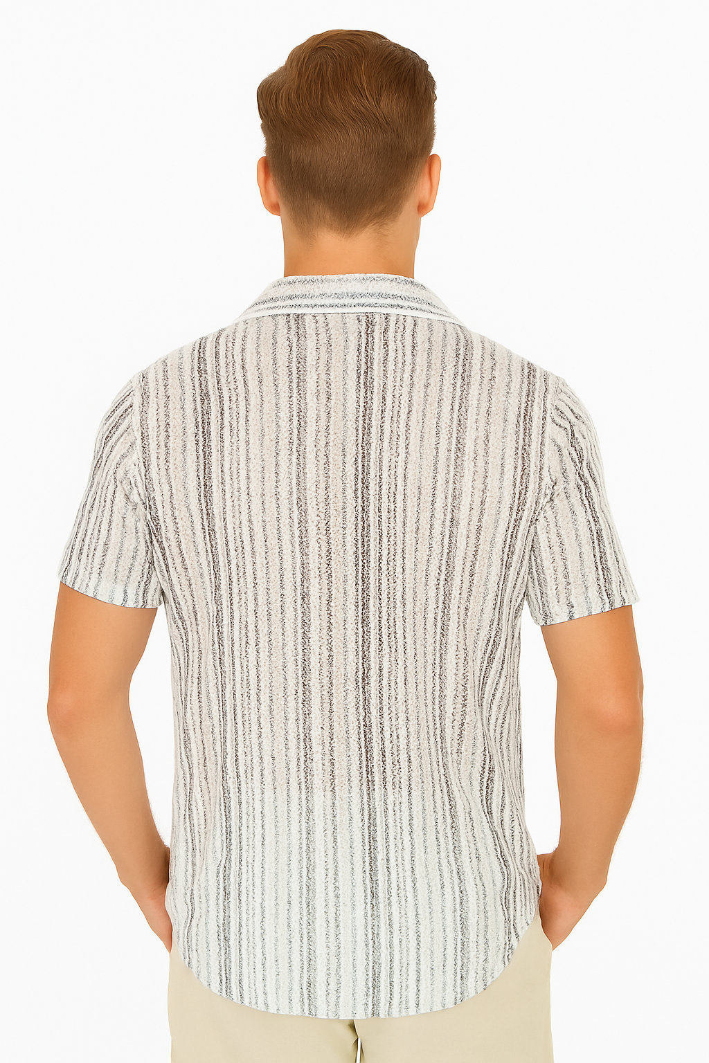 Featuring a classic button-up front, short sleeves, and a resort-inspired stripe pattern, this shirt is ideal for pairing with linen pants, shorts, or swimwear for an effortless day-to-night look. The semi-sheer mesh design gives it a trendy, upscale vibe while still keeping it casual and comfortable. Whether you’re strolling by the ocean, enjoying a resort dinner, or simply relaxing on a sunny weekend, this breathable men’s shirt offers the perfect balance of laid-back style and elevated resortwear fashion.
