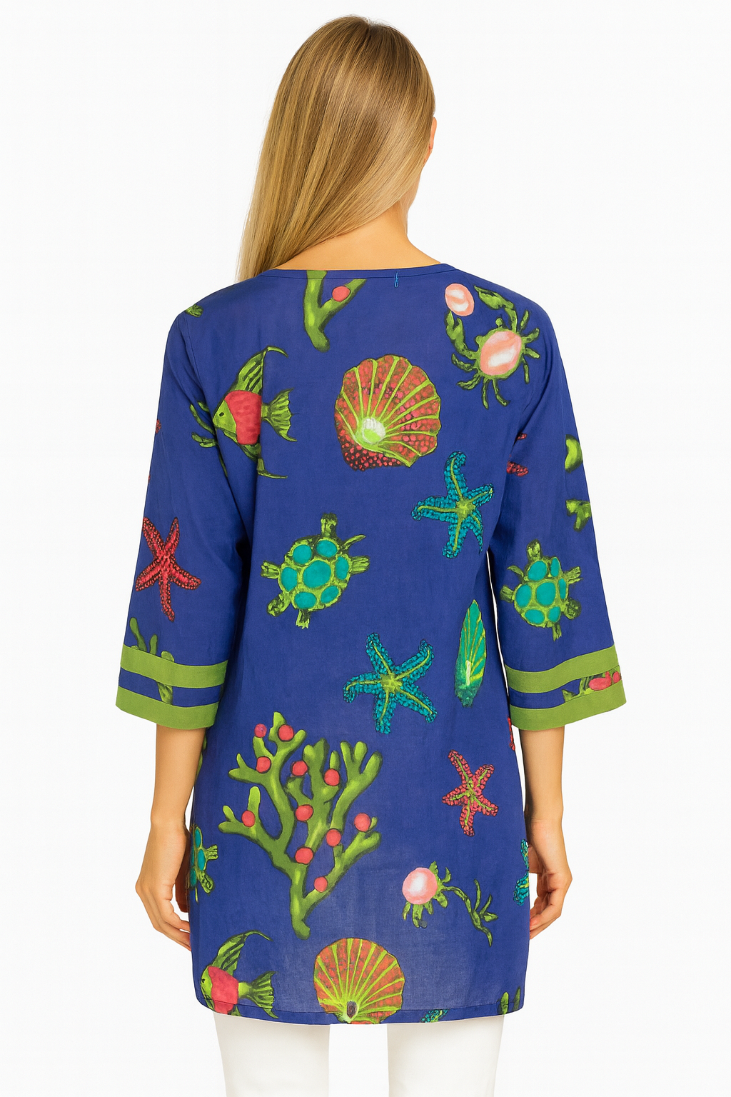 Royal Blue Sea Life Cotton Tunic – 100% Cotton Handcrafted Resort Wear Top with Turtles, Starfish & Coral Design - LCT3691