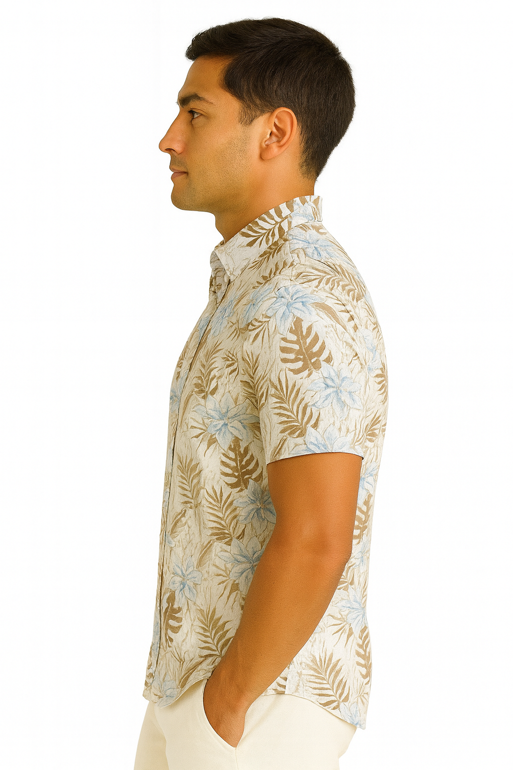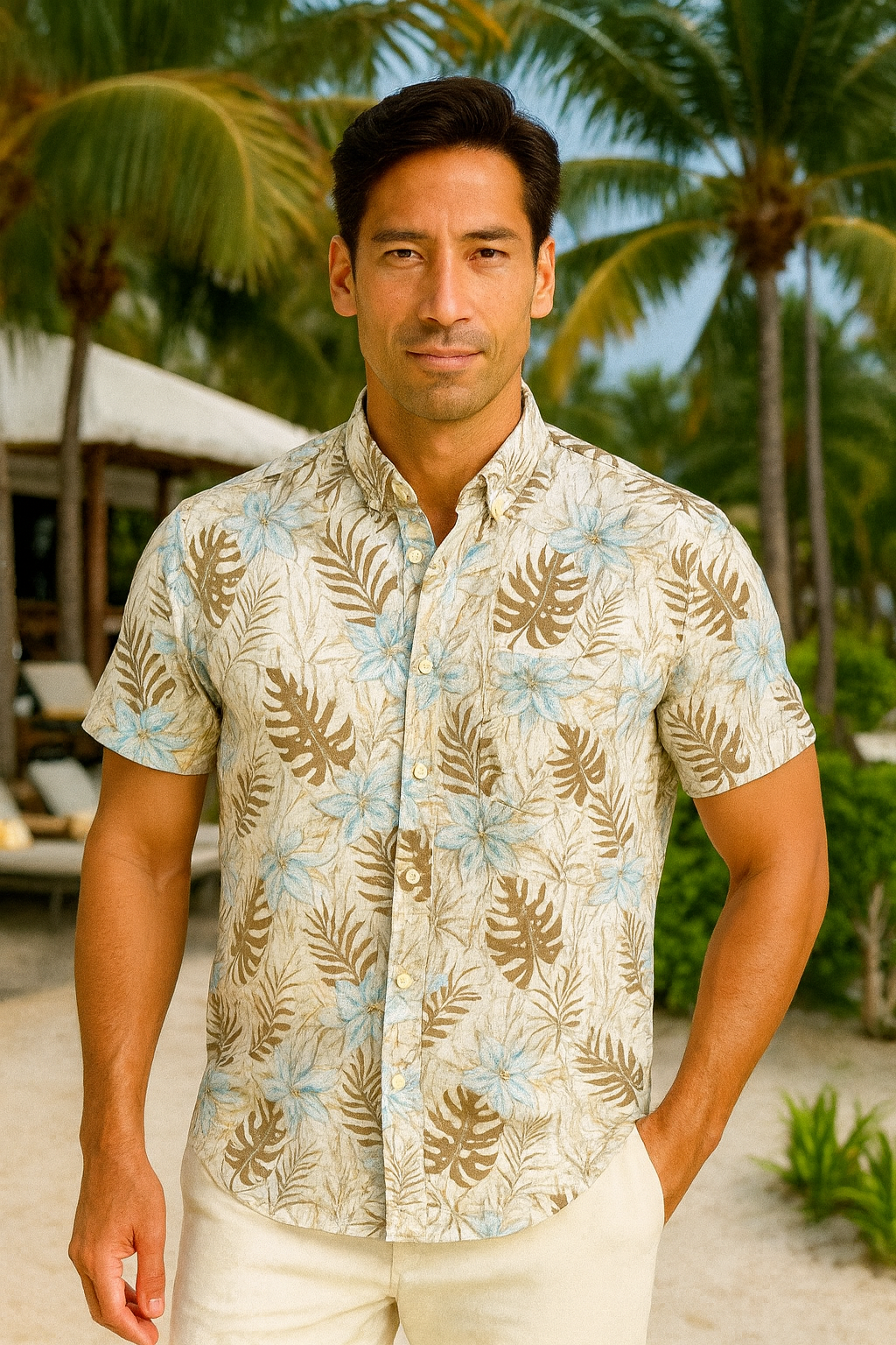 Bring effortless tropical style to any occasion with the Sandy Palms Cotton Gauze Shirt. Designed with a breathable linen-cotton blend, this short-sleeve button-down combines all-day comfort with a refined resort look. The soft beige base and cool blue floral-palm print capture the relaxed elegance of island living, perfect for everything from vacations to casual beach weddings.
