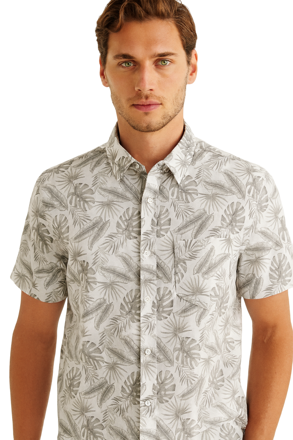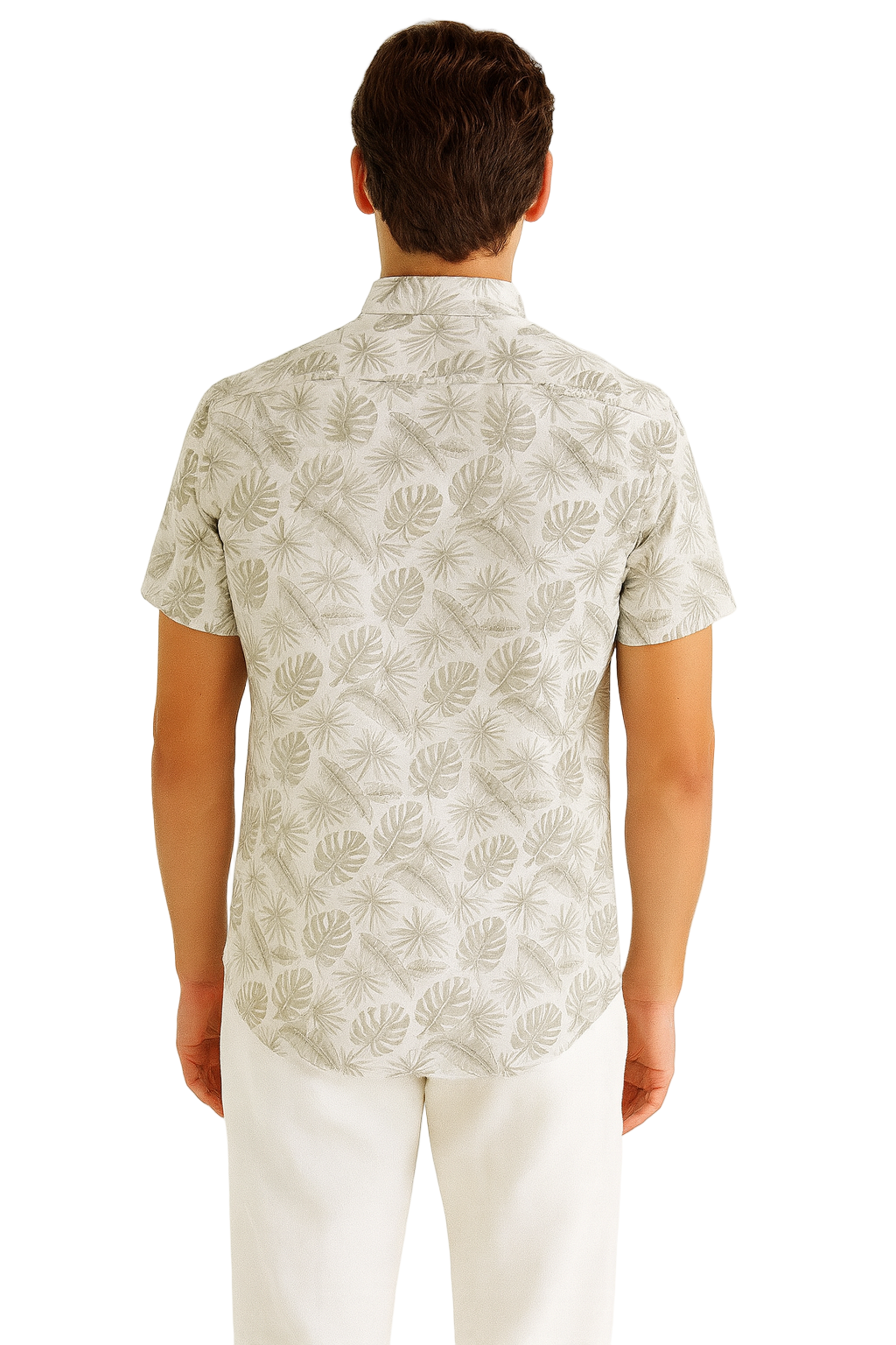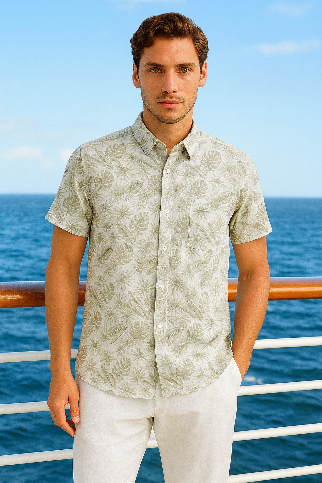 Cool, crisp, and refined — the Silver Palm Cotton Gauze Shirt delivers effortless tropical elegance. Crafted from airy 100% cotton gauze, this short-sleeve button-down is lightweight, breathable, and perfect for warm-weather style. The subtle silver palm leaf print offers a sophisticated tropical vibe, making it versatile enough for vacations, beach weddings, or resort evenings.