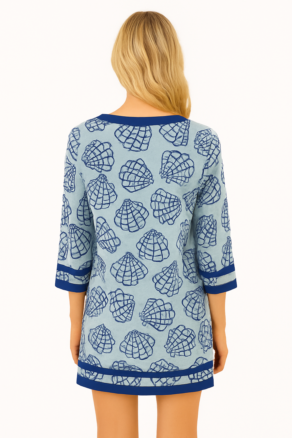 The vibrant ocean-inspired print features seashells, starfish, coral, and conch shells in shades of turquoise, seafoam green, and sandy beige—capturing the natural beauty of the sea. Each element of the pattern is carefully detailed, bringing a lively tropical charm to your wardrobe. Whether you’re wearing it as a beach cover-up, a casual daytime dress, or a resort dinner outfit, it transitions effortlessly from day to night.