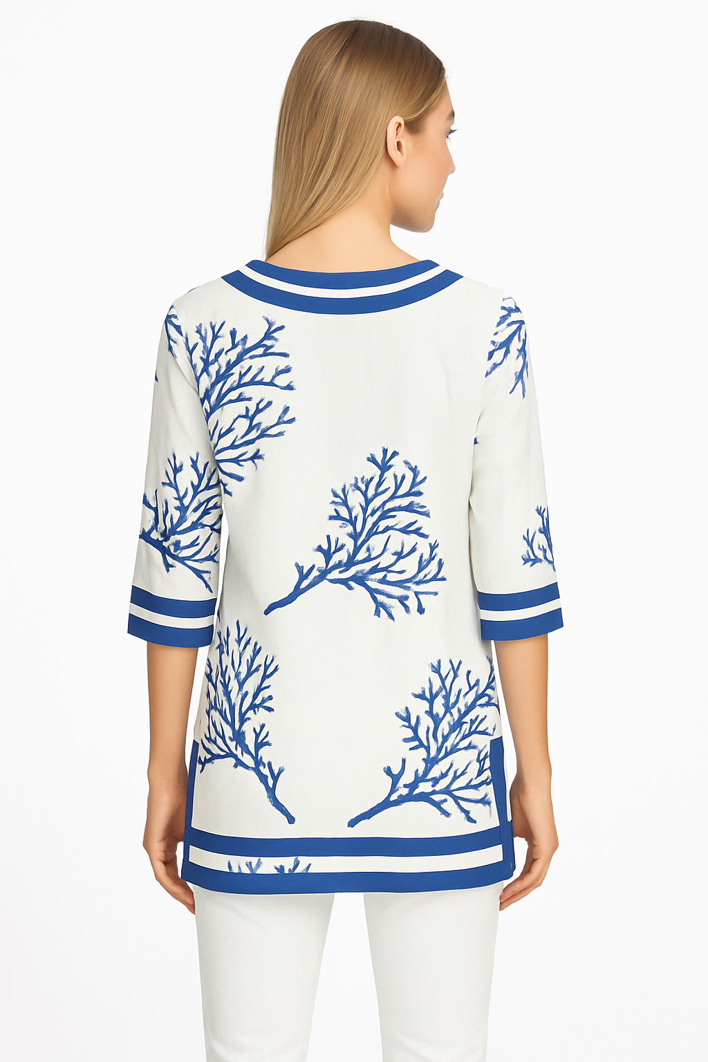 The tunic features a flattering V-neckline accented with bold blue trim that frames the face beautifully and adds a refined touch. The three-quarter sleeves provide comfortable coverage while maintaining a breezy, relaxed feel—perfect for sunny days or cool coastal evenings. The contrast border detailing at the sleeves and hem adds structure and polish, making this top versatile enough to pair with white pants, denim, or even as a stylish beach cover-up over swimwear.