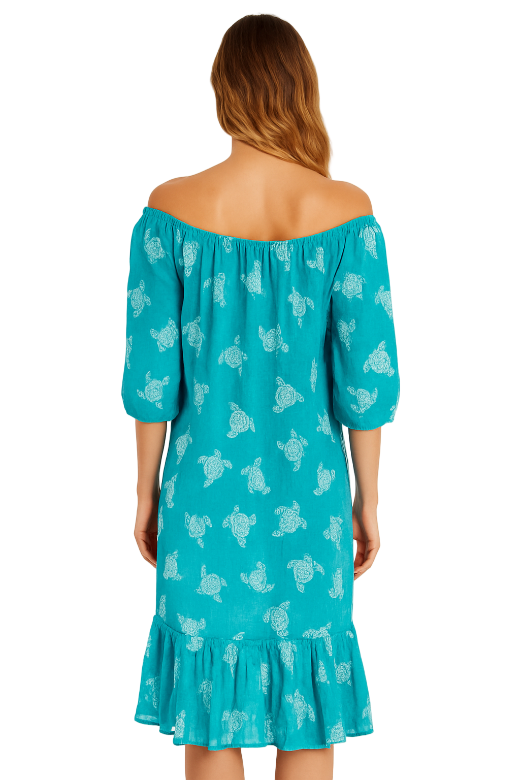 Women’s Turquoise Sea Turtle Print Cotton Tunic Dress – 100% Lightweight Gauze Beach Cover Up, Off-Shoulder Resort Wear- LCD3588